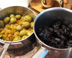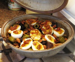 Now it is time to build the dish, and particular architecture is demanded. Place the meat mixture in the bottom of the tagine, top with prunes, then the olive raisin mixture, and finally arrange the halved boiled eggs and sprinkle with almonds. Add some juice and gently boil in the tagine for about 15 minutes, so that all the elements have been cooked through but not cooked so long as to lose their individual flavors. 8 servings
