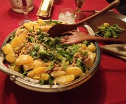 We once again celebrated the season with our annual Clay Coyote Christmas party. We always include a “few of our favorite things” each year… Local ingredients, a selection of Paula Wolfert recipes, dishes made in Clay Coyote pottery, and ice cream. This year Tom and Betsy made roasted pork from Dale Rusch’s farm here in Hutchinson. Virginia made an artichoke dip in a Clay Coyote casserole dish. Michele created this salad recipe from Paula’s new book, The Food of Morocco. Moroccans take on salad has altered my perception on how to begin a meal. Instead of focusing on what dressing will cover the vegetables, they seem to primarily consider freshness and vibrancy.