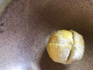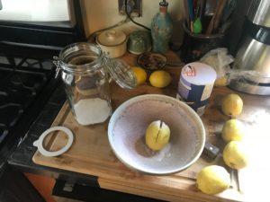 Here’s where the preparations begin. If you wish, you can soften the rinds of the lemons by soaking them in water for three days, changing the water out each day. What you will do with the lemons is quarter them from the top to within ½ inch of the bottom. Put salt in the exposed flesh and close up the fruit. Put one tablespoon of salt on the bottom of the mason jar. Pack the lemons in the jar, continuing to add salt and the optional spices. To make more room, press the lemons down to add more lemons and to release some natural lemon juice. Leave some space at the top of the jar and put the lid on.